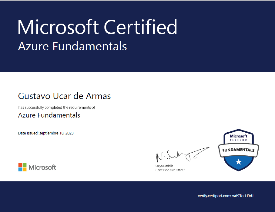 certificado realizado el día 18/09/2023 a traves de certiport. Microsoft Azure Fundamental Az-900