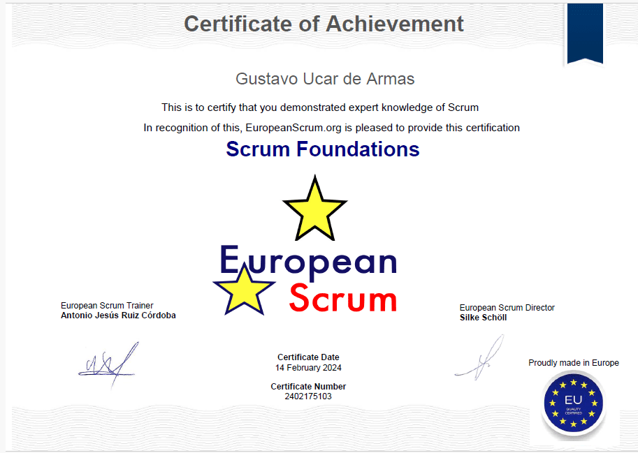 20/02/2024 certificación de EuropeanScrum – Scrum Master.